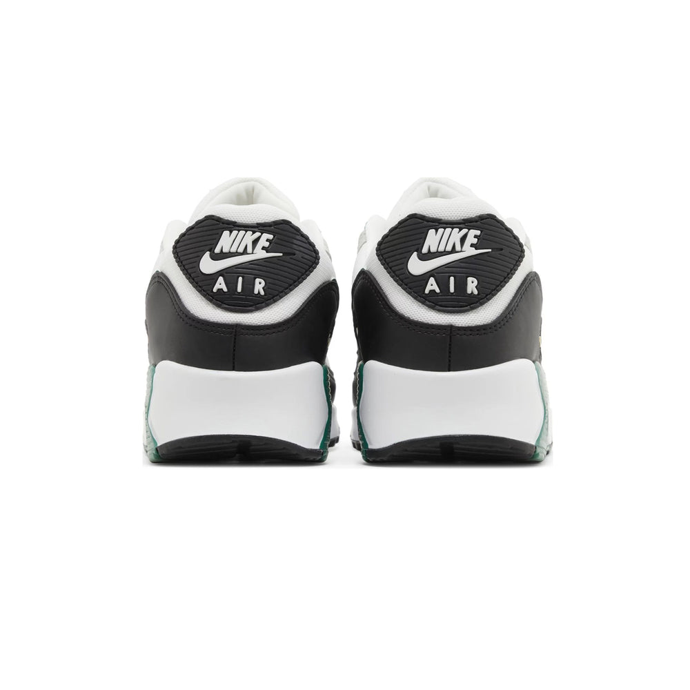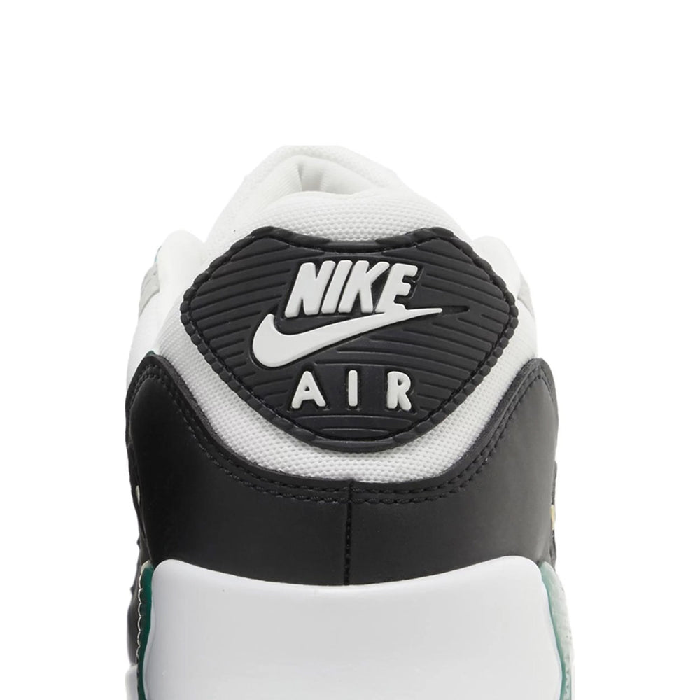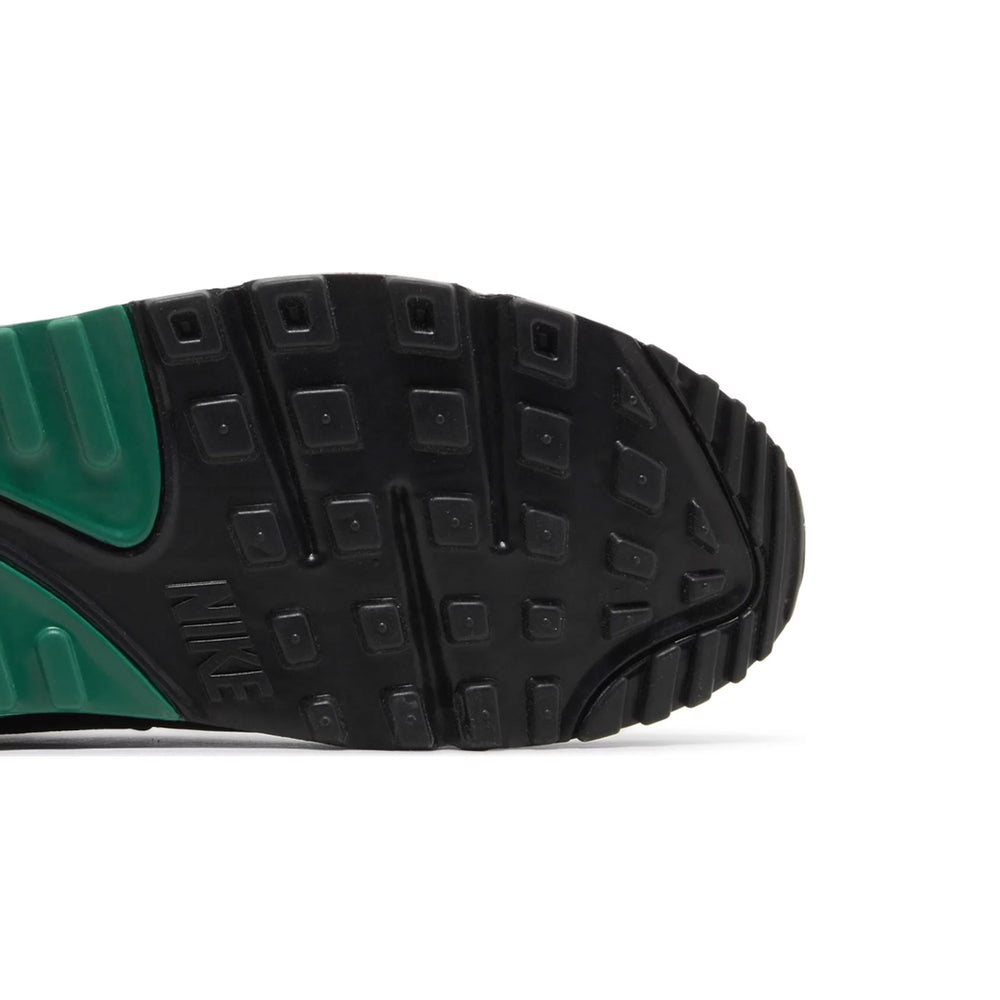 The Nike Air Max 90 'Malachite' features a predominantly white leather base, with synthetic overlays in shades of grey and striking hits of malachite green that add a vibrant contrast. The classic Air Max branding on the tongue, heel, and side panels are also accented in malachite, offering a cohesive look that ties the colorway together. The iconic visible Air unit in the heel, a hallmark of the Air Max series, remains a central design element, providing not just a nod to the shoe’s performance roots but also a statement of style. The shoe is finished with a durable rubber outsole that delivers traction and support, making it as functional as it is fashionable.