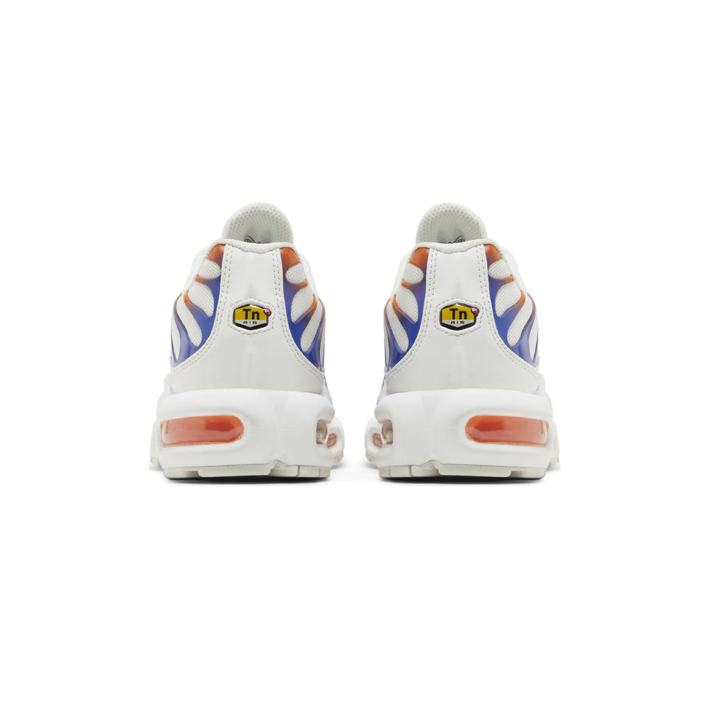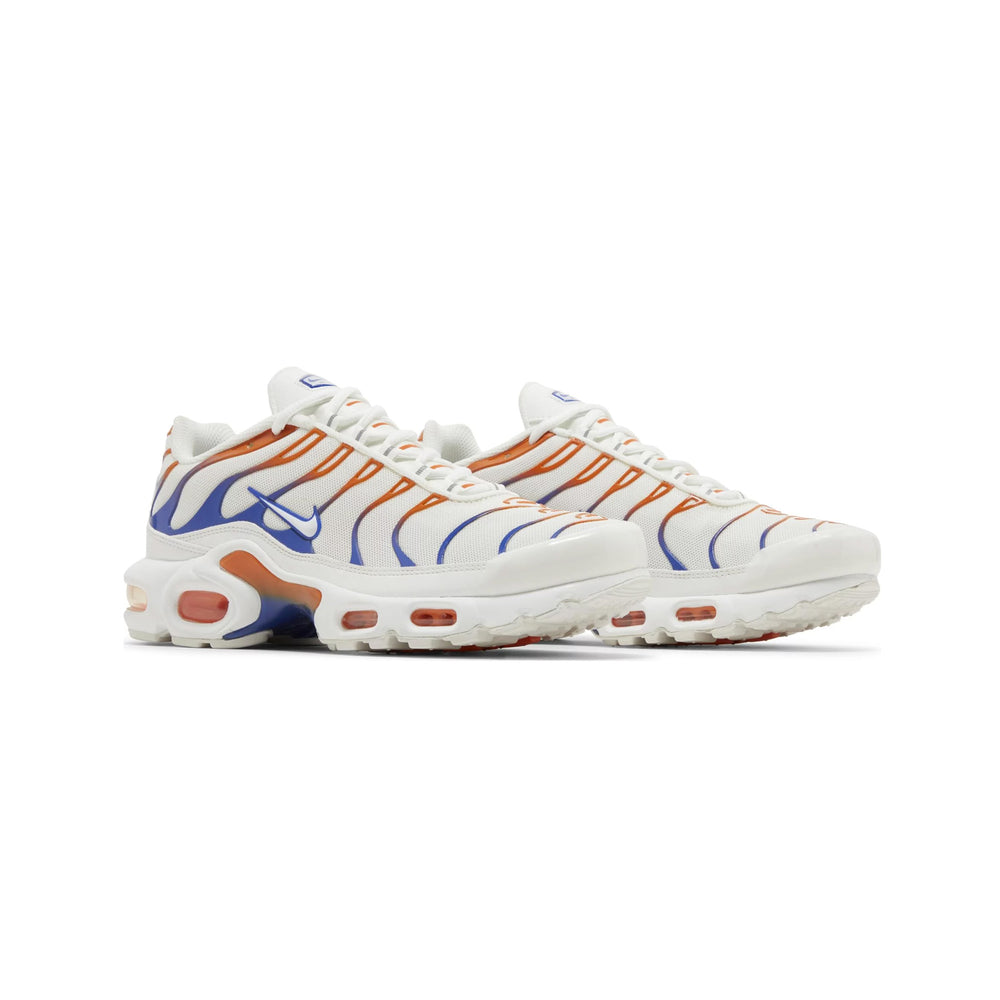 Crafted with a premium white mesh upper, the Nike Air Max Plus TN 'Knicks' Women's edition features striking blue and orange accents, paying homage to the Knicks' signature color scheme. The synthetic overlays, rendered in a bold blue, create a dynamic and structured look, while the contrasting orange Swoosh and branding elements add a pop of color that captures attention. The shoe is anchored by the distinctive Tuned Air cushioning system, providing superior support and impact protection. Reflective details enhance visibility, making it a perfect choice for evening wear. A durable rubber outsole ensures optimal traction, while the lightweight midsole delivers comfort for all-day wear.