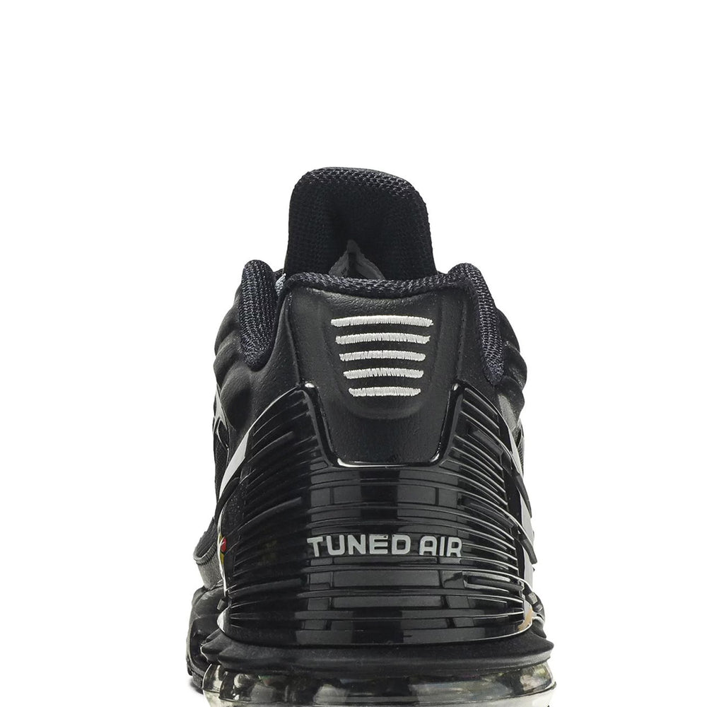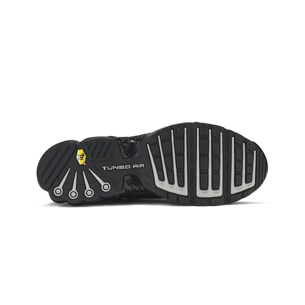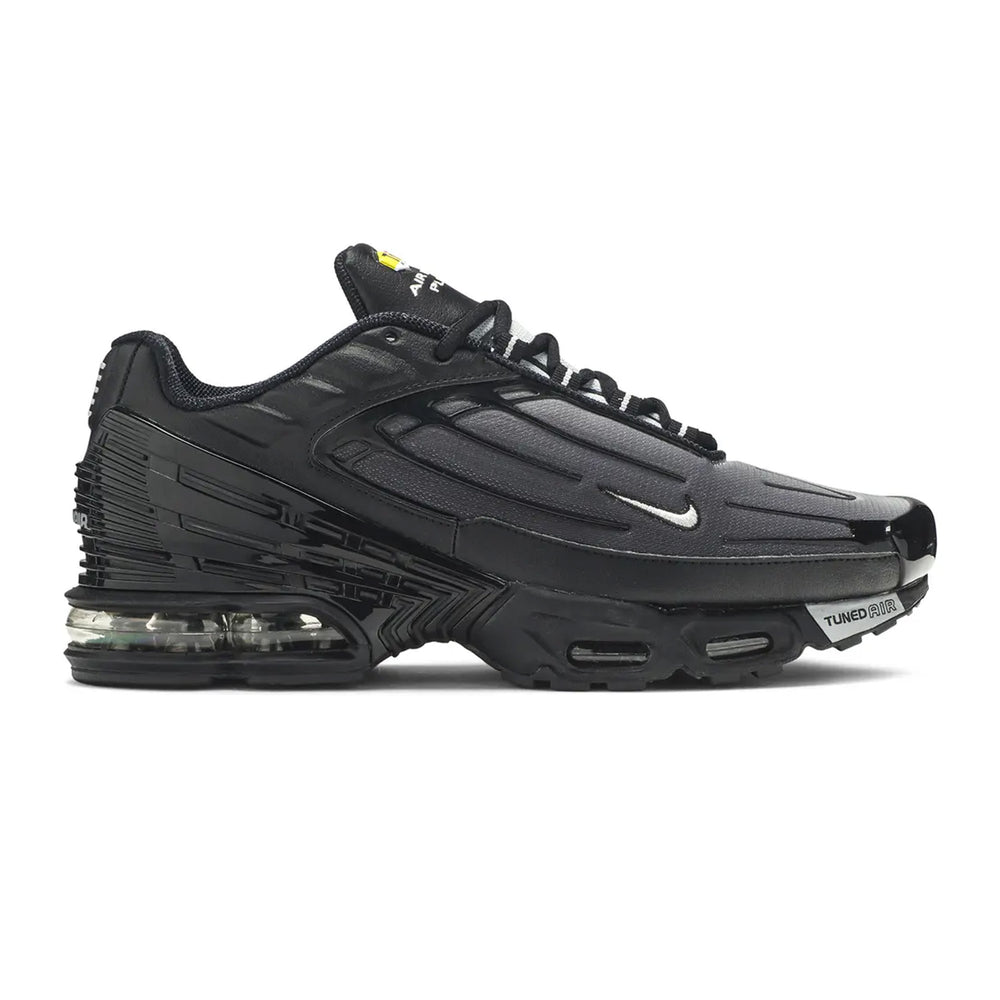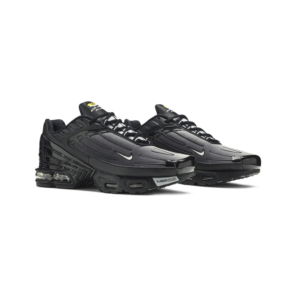 The Nike Air Max Plus TN 3 'Stencil Swoosh Black' showcases a sleek, tonal black mesh upper, complemented by premium leather overlays for enhanced durability. The standout feature of this model is the bold "Stencil Swoosh" logo on the lateral side, adding a rebellious touch to the iconic silhouette. This design innovation is paired with the signature Air Max cushioning technology, ensuring superior comfort with every step. The shoe’s sleek black colorway is offset by reflective accents that enhance visibility and elevate its futuristic appeal. The midsole features the classic Tuned Air cushioning system, delivering responsive support for all-day wear. With its combination of performance technology and urban style, the Air Max Plus TN 3 'Stencil Swoosh Black' is designed to make a statement both on the streets and in the gym.