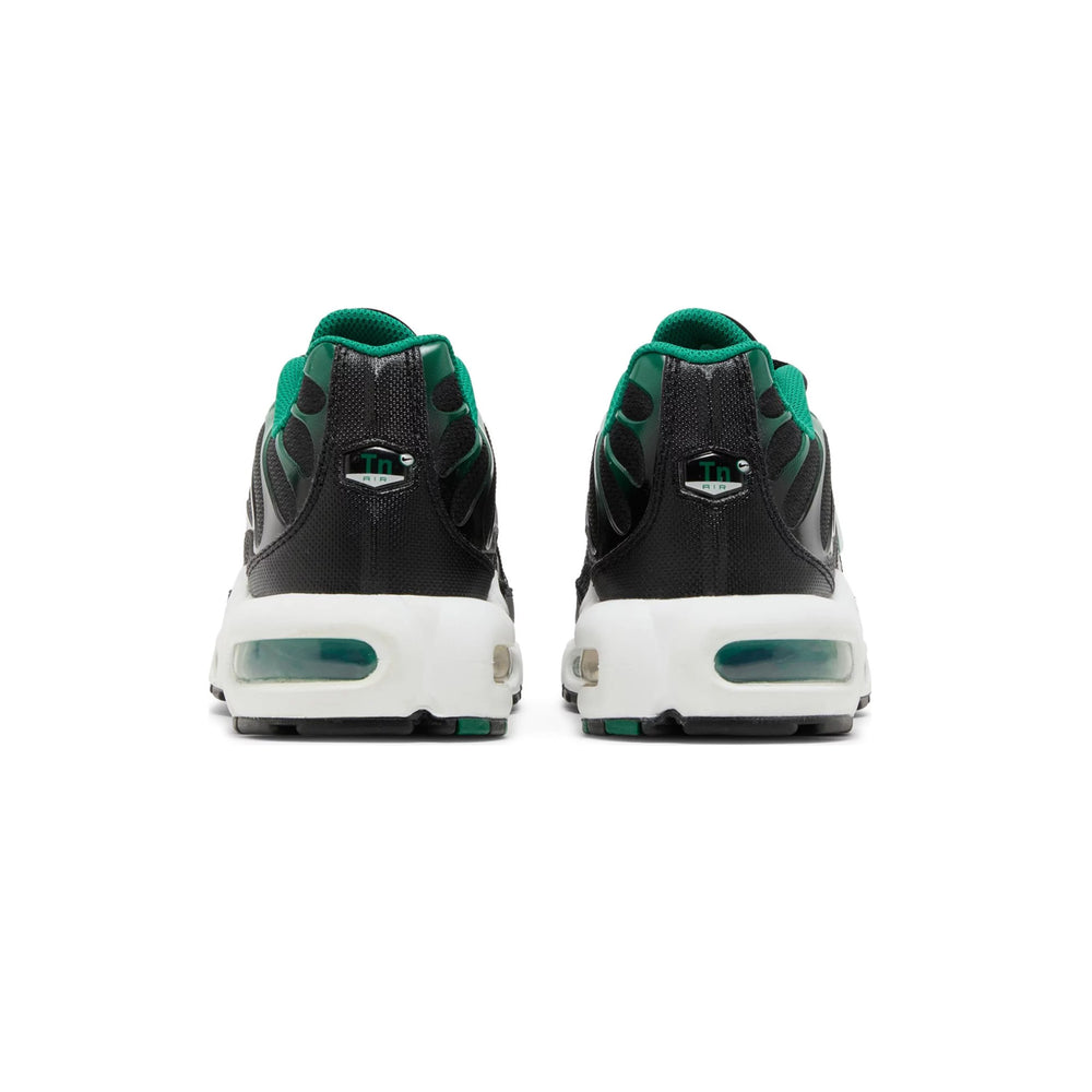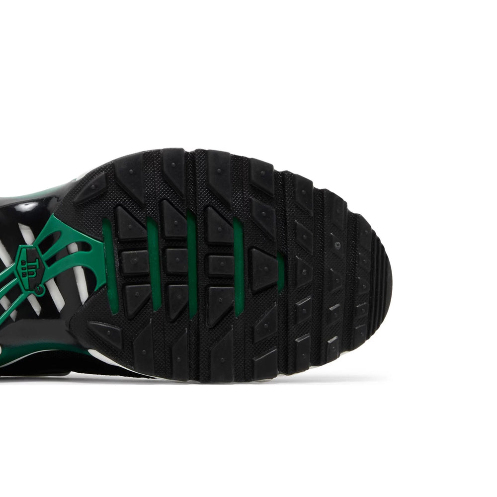 The Nike Air Max Plus TN 'Black Malachite' features a sleek black mesh upper that is complemented by contrasting malachite green TPU overlays, mirroring the intricate patterns of the precious stone. The shoe's unique gradient effect—from deep black to a rich, vibrant green—creates a visually captivating experience. Signature to the Air Max Plus design, the sneaker incorporates a full-length Tuned Air cushioning system, offering unparalleled comfort and support. Reflective elements enhance visibility and safety, while the distinctive plastic toe cap and heel counter provide durability. The shoe is completed with a black rubber outsole, ensuring reliable traction across various surfaces.