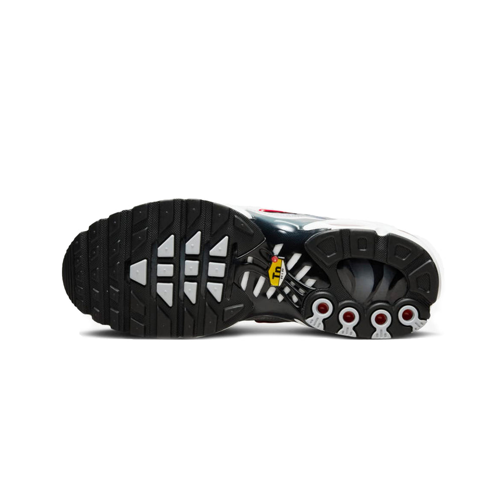 The Nike Air Max Plus TN 'Silver Bullet' features a dynamic silver mesh upper complemented by reflective overlays that capture light from every angle, enhancing its striking visual appeal. The shoe's design is further elevated by the signature wavy TPU accents that provide structural support and a futuristic look. The midsole houses the revolutionary Tuned Air technology, delivering tailored cushioning and superior impact protection. A bold red Swoosh adds a pop of color, standing out against the metallic backdrop. The black rubber outsole, with its durable traction pattern, ensures stability and grip, making it ideal for both athletic endeavors and streetwear style.