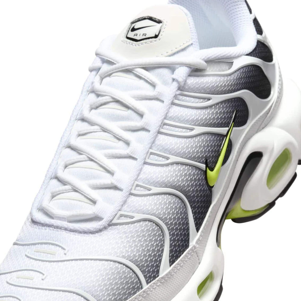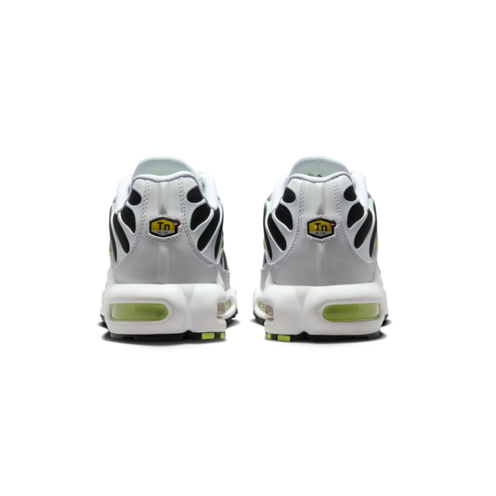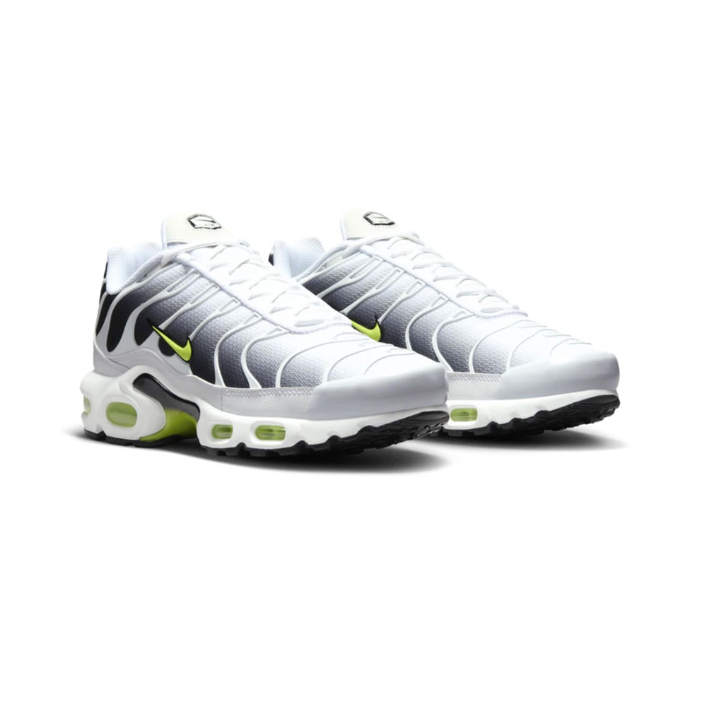 This iteration of the Nike Air Max Plus TN is crafted with a clean white mesh upper, complemented by black TPU overlays that create the signature wavy lines, a hallmark of the TN design. Volt accents on the tongue, Swoosh, and air bubbles infuse a dynamic pop of color, enhancing the shoe's overall appeal. The shoe’s robust midsole, equipped with Nike’s Tuned Air cushioning technology, ensures exceptional comfort and stability, making it ideal for both casual and performance use. The mix of monochrome tones with neon Volt offers a striking visual balance, while the durable rubber outsole guarantees long-lasting traction.