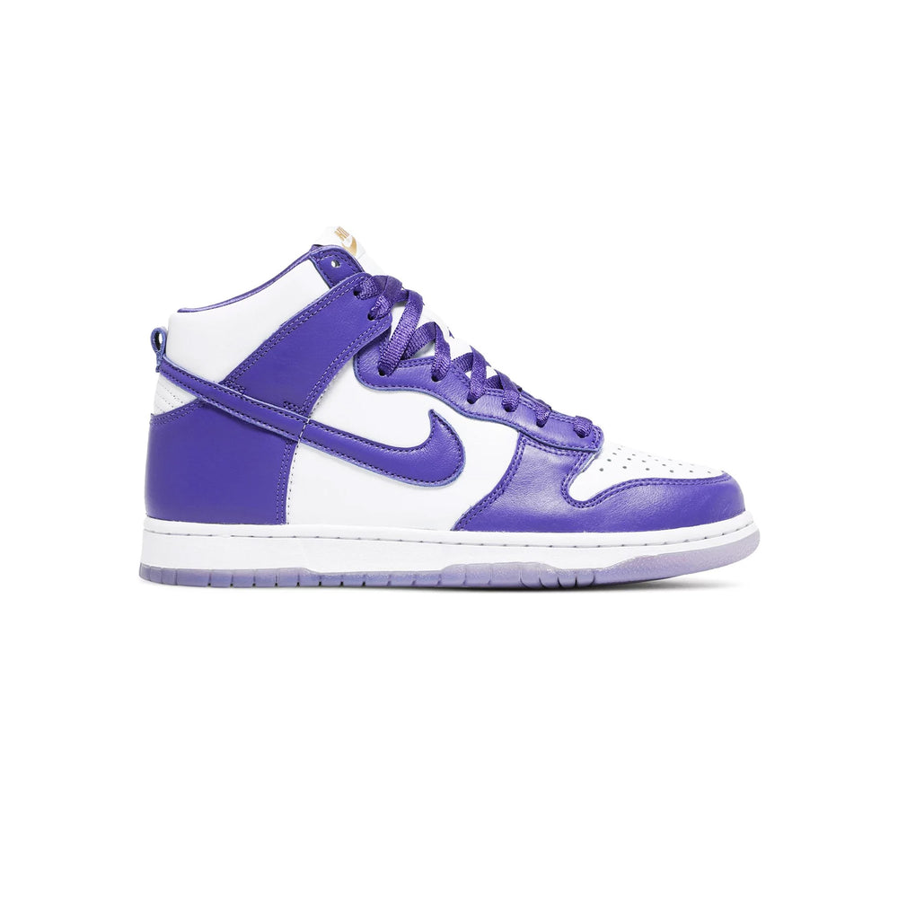 Crafted with a smooth white leather base, the 'Varsity Purple' edition features bold purple overlays that add a rich contrast and visual appeal. The high-top design offers additional ankle support, making it not only stylish but also functional for everyday wear. The iconic Swoosh logo in matching purple leather seamlessly blends with the overlays, while the white midsole and purple rubber outsole provide a cohesive finish. This sneaker pays homage to the original Dunk design from the 1980s, updated with modern materials and construction techniques to ensure superior comfort and durability. The color palette is a nod to university team colors, making it a perfect choice for both sports enthusiasts and fashion-forward individuals.
