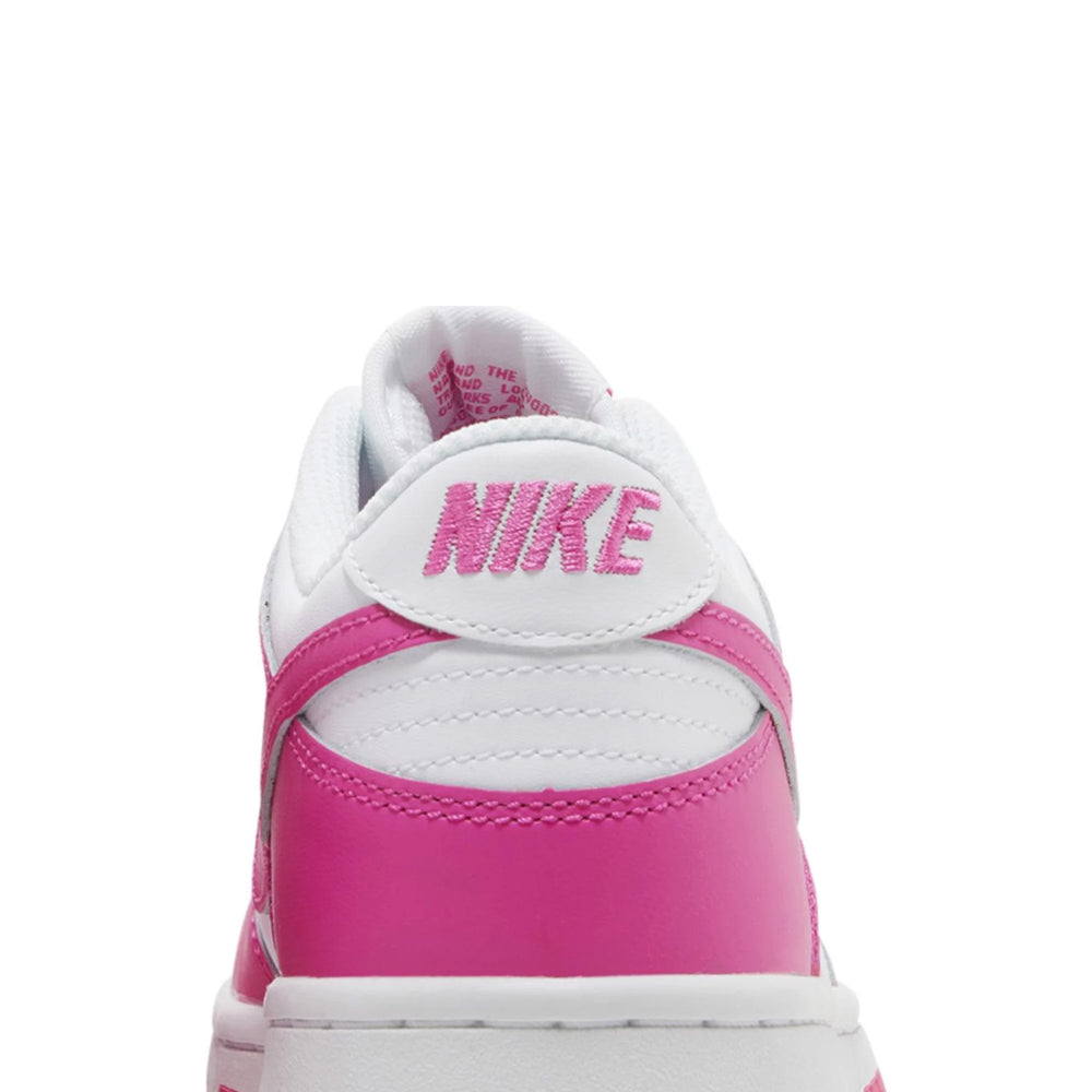 Crafted with a white leather base, the Nike Dunk Low 'Laser Fuchsia' GS (Grade School) is accentuated by a series of dynamic overlays. The titular "Laser Fuchsia" hues envelop the mudguard, eyestays, and heel, injecting a burst of energetic color that contrasts sharply with the foundational white. Complementing these overlays, the midsole is rendered in a crisp white, while the outsole mirrors the "Laser Fuchsia" tone, ensuring continuity and a cohesive aesthetic from top to bottom.