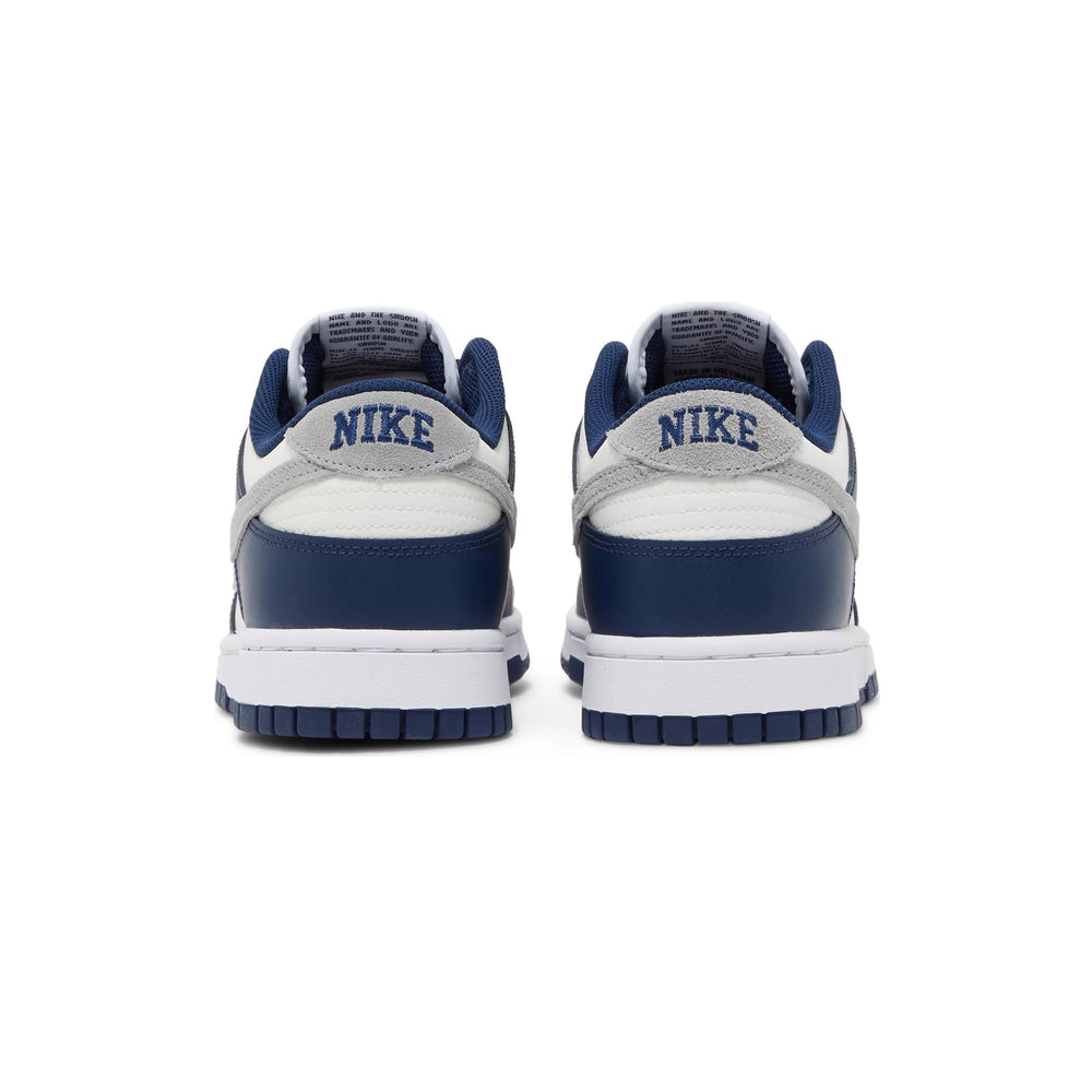 Crafted with a premium leather upper, the Nike Dunk Low 'Summit White Midnight Navy' features a pristine 'Summit White' base that exudes elegance and versatility. The smooth leather construction is complemented by 'Midnight Navy' overlays that provide a striking contrast, enhancing the sneaker's visual appeal. The iconic Nike Swoosh, also in 'Midnight Navy', adds a cohesive touch, while the crisp white midsole and navy outsole complete the look with a balanced, harmonious finish. This iteration stays true to the Dunk Low's heritage with its traditional design elements, yet the elevated color scheme ensures it stands out in any collection.