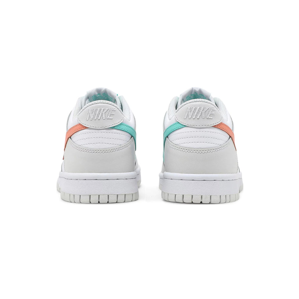 The Nike Dunk Low 'Tropical Twist' GS is constructed with a crisp white leather base, providing a clean canvas that allows the vibrant overlays to stand out. The titular 'Tropical Twist' shade, a bright teal, adorns the leather overlays, Swooshes, and laces, creating a striking contrast against the white background. Complementing the teal are black accents on the tongue, heel tab, and Nike branding, which add depth and balance to the design. The classic Dunk Low silhouette is maintained, ensuring a timeless appeal, while the combination of leather and synthetic materials guarantees durability and comfort for everyday wear. The sneaker is finished with a white midsole and a teal rubber outsole, offering both style and functionality.