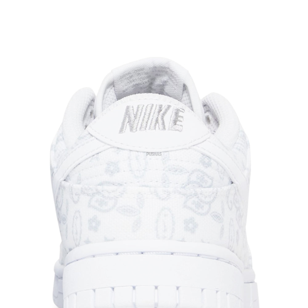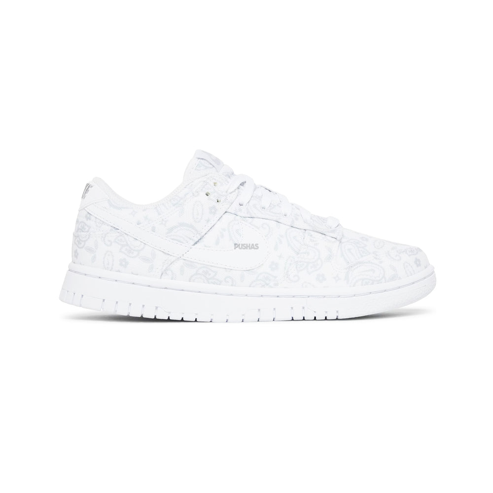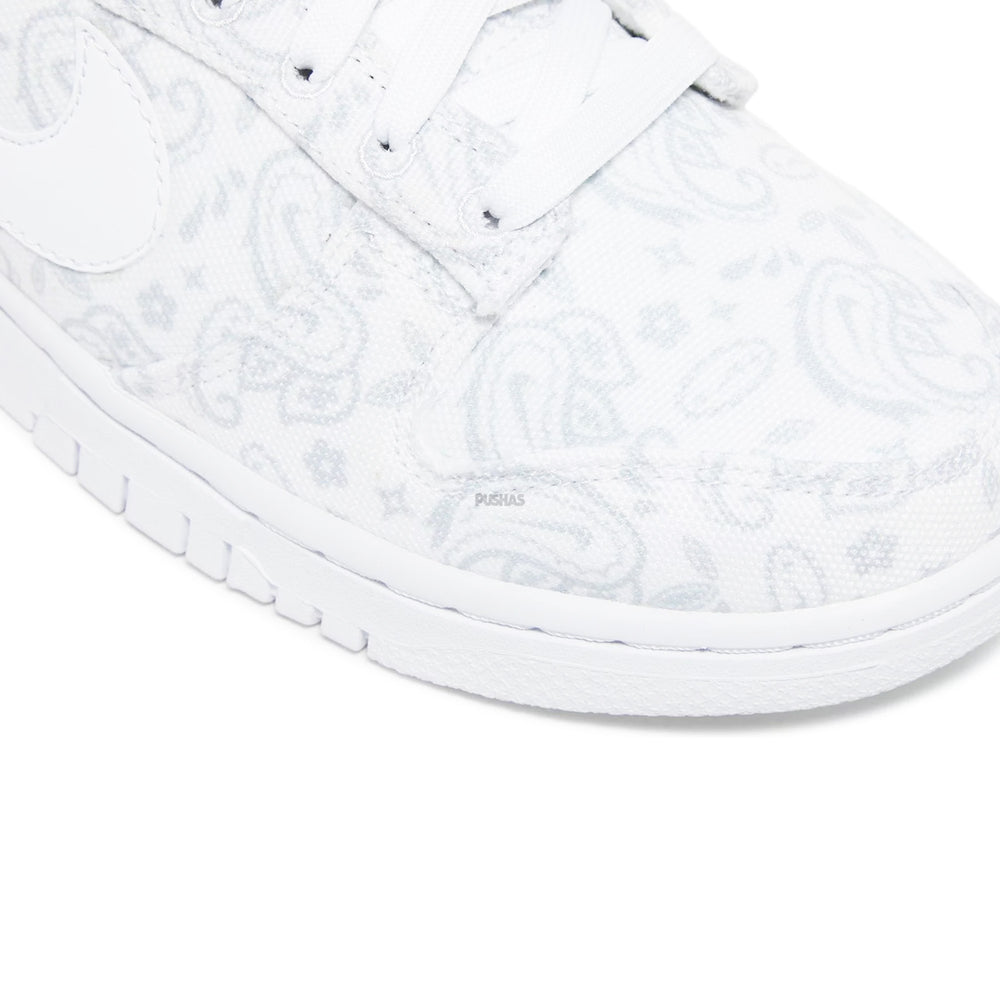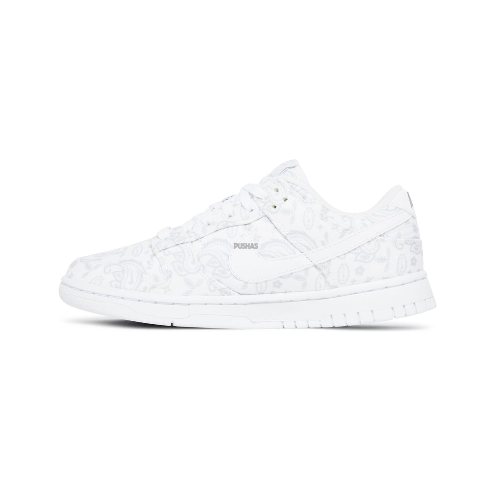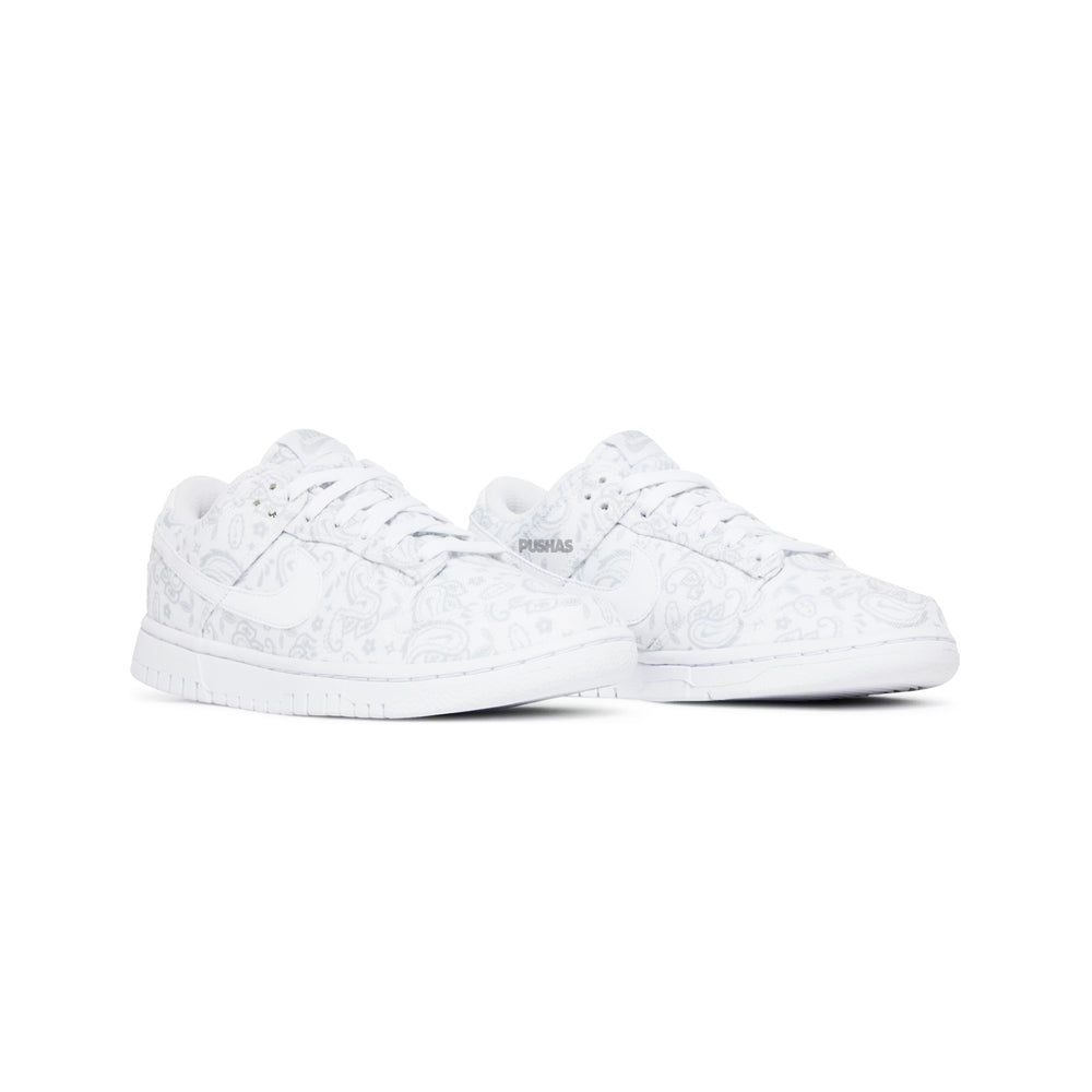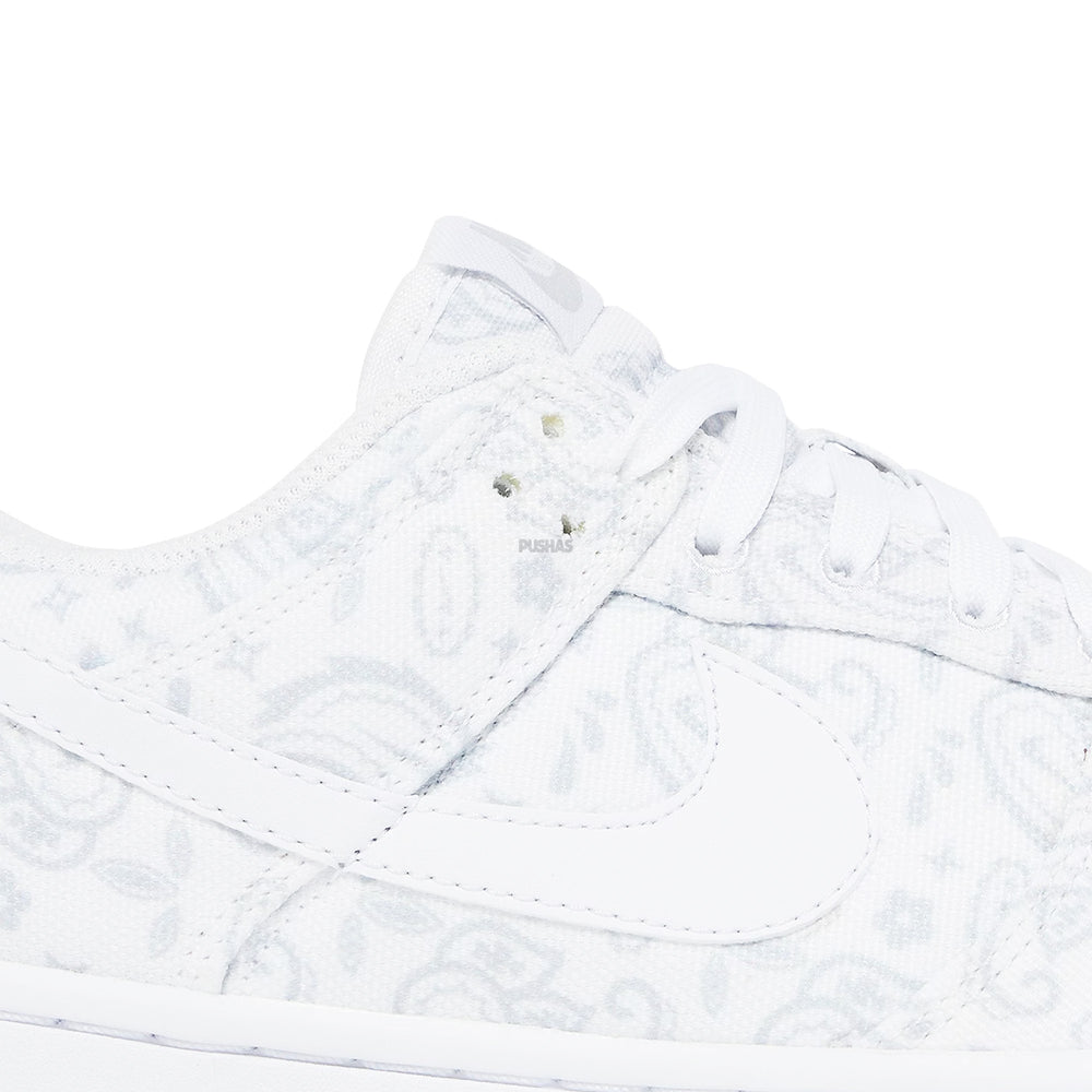 Crafted with meticulous attention to detail, the Nike Dunk Low 'White Paisley' showcases a pristine "White" leather upper, exuding sophistication and versatility. The standout feature is the intricately designed "White Paisley" print, gracefully adorning the Swooshes and heel tab, adding a touch of refined artistry. This subtle yet striking pattern elevates the sneaker's aesthetic, making it a versatile piece for both casual and stylish ensembles. The clean white midsole and matching rubber outsole ensure a cohesive look, while the perforated toe box enhances breathability, providing comfort and functionality.