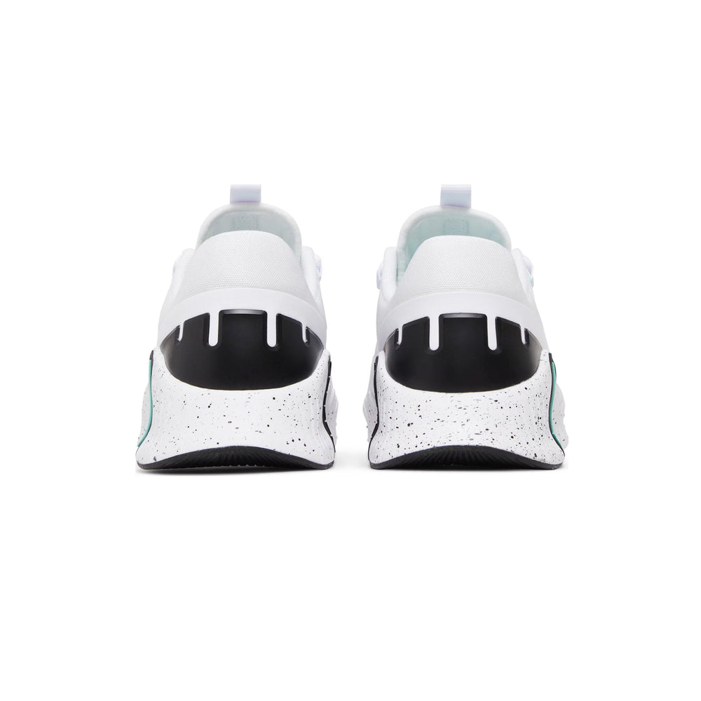 The Nike Free Metcon 5 'White Emerald Rise' features a crisp "White" upper with "Emerald Rise" accents that add a pop of color to its streamlined silhouette. The shoe is designed with a breathable mesh upper, enhancing airflow during intense sessions, while the Free technology midsole provides superior flexibility, allowing for natural foot movement. The wider heel base ensures stability for weightlifting, and the rubber outsole delivers exceptional traction across multiple surfaces. A padded collar and dual-density foam offer additional comfort, while the durable TPU cage supports lateral movements, making this shoe a staple for versatile training routines. This balance of form and function is what elevates the Free Metcon 5 beyond just a workout shoe.