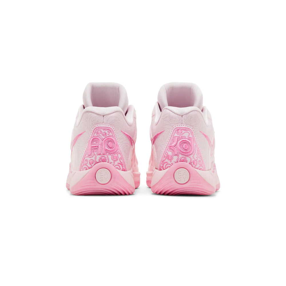 The Nike KD 17 NRG 'Aunt Pearl' (2024) features a striking "White" leather base with pink and purple hues, symbolizing the fight against cancer and embodying the spirit of love and resilience. The upper showcases intricate floral patterns, a nod to Aunt Pearl’s influence on Durant’s life. The signature pink and purple color scheme is complemented by metallic silver accents that add a touch of elegance. The shoe’s Flyknit construction and Zoom Air cushioning offer lightweight support and explosive speed, making this sneaker not only a tribute but also a high-performance on-court asset. The heel counter features a unique pearl-inspired graphic, solidifying the theme and paying respect to Durant's Aunt Pearl.