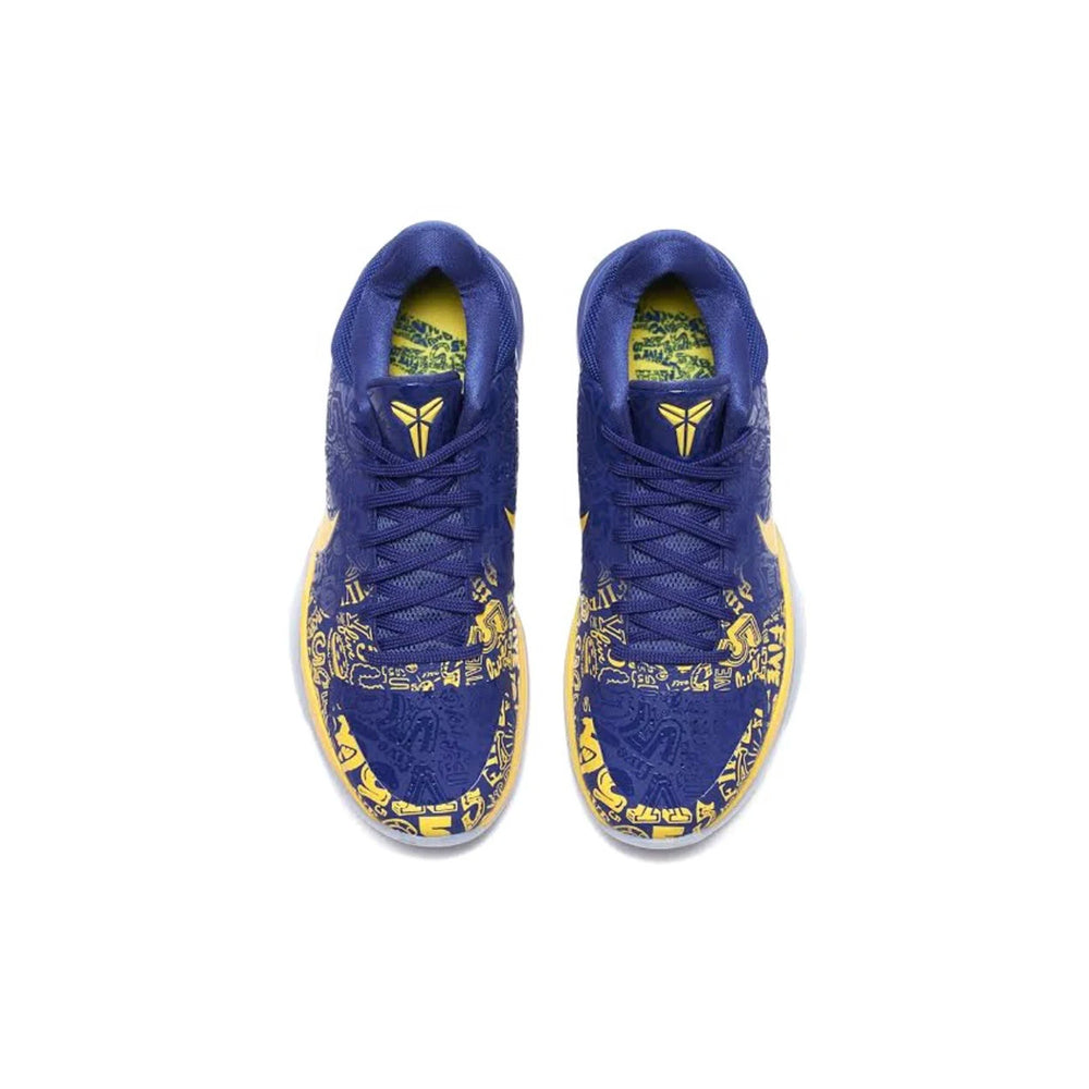 Crafted with a bold, blue synthetic upper, the Nike Kobe 5 Protro '5 Rings' is intricately detailed with patterns and symbols that reflect Bryant's championship legacy. The sneaker features gold accents on the Swoosh and heel, symbolizing the pinnacle of success. The midsole combines Nike’s advanced Zoom Air technology with a Phylon carrier for enhanced responsiveness and cushioning, ensuring optimal performance on the court. The outsole’s herringbone traction pattern is engineered for superior grip, while the padded collar and tongue offer added support and comfort.
