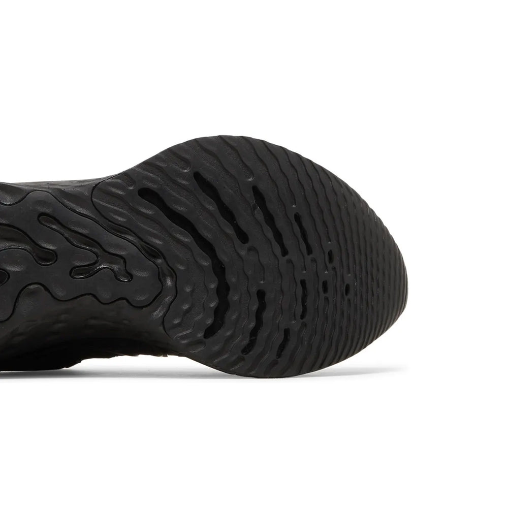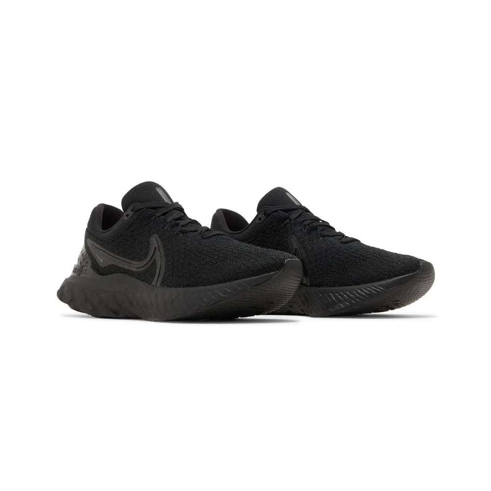 The Nike React Infinity Run Flyknit 3 'Triple Black' showcases an engineered Flyknit upper, providing a sock-like fit that supports every stride while offering breathability. The midsole features Nike’s React foam, known for its lightweight, responsive cushioning, designed to reduce the risk of injury and offer a smooth, stable ride for long-distance runs. The sleek, black-on-black color scheme gives the shoe a modern and minimalist appeal, with subtle branding details like the Swoosh on the side and the Nike React logo on the heel tab. A rubber outsole with strategically placed traction points offers superior durability and grip, whether you're on the road or hitting the pavement.
