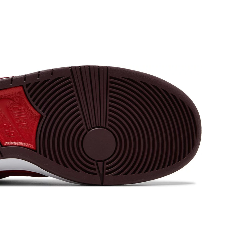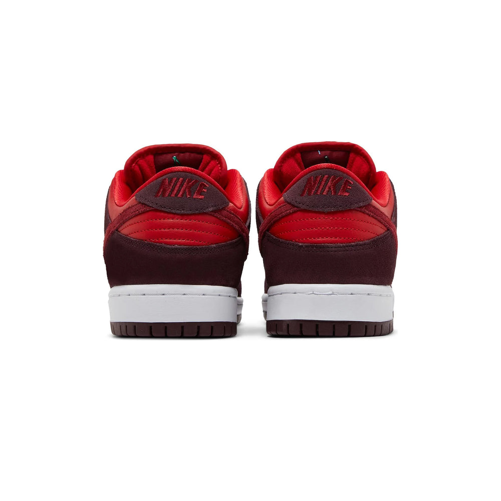 The Nike SB Dunk Low 'Cherry' features a rich blend of deep red premium suede and leather that pays homage to the fruit's lush skin, complemented by contrasting maroon accents on the overlays. The tongue label showcases a cheerful cherry graphic, reinforcing the playful theme. A clean white midsole provides contrast, enhancing the visual appeal while sitting atop a gum rubber outsole that ensures reliable traction and durability for skateboarding.