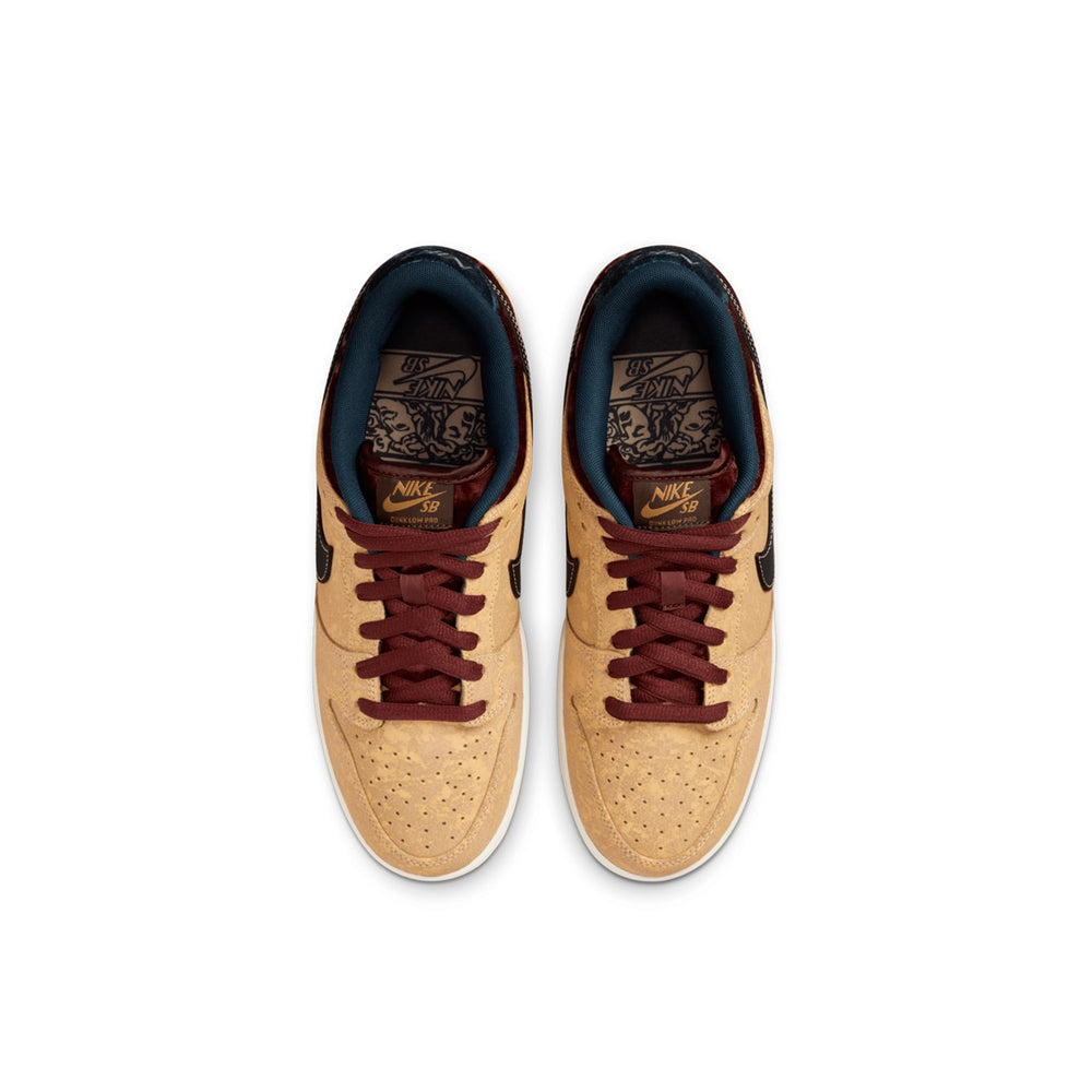 The Nike SB Dunk Low 'City of Cinema' features a base crafted from luxurious black suede, symbolizing the elegance and timeless appeal of Paris. The sneaker is elevated with a striking array of color accents, including deep red swooshes and a contrasting white midsole, mimicking the bright lights and contrasting hues of cinema marquees. The laces add another layer of depth with a blend of black and red, while the translucent outsole enhances the shoe's overall visual impact. Notable details such as film-reel-inspired designs on the insoles and subtle nods to French cinema throughout the silhouette bring together a captivating blend of art and streetwear.