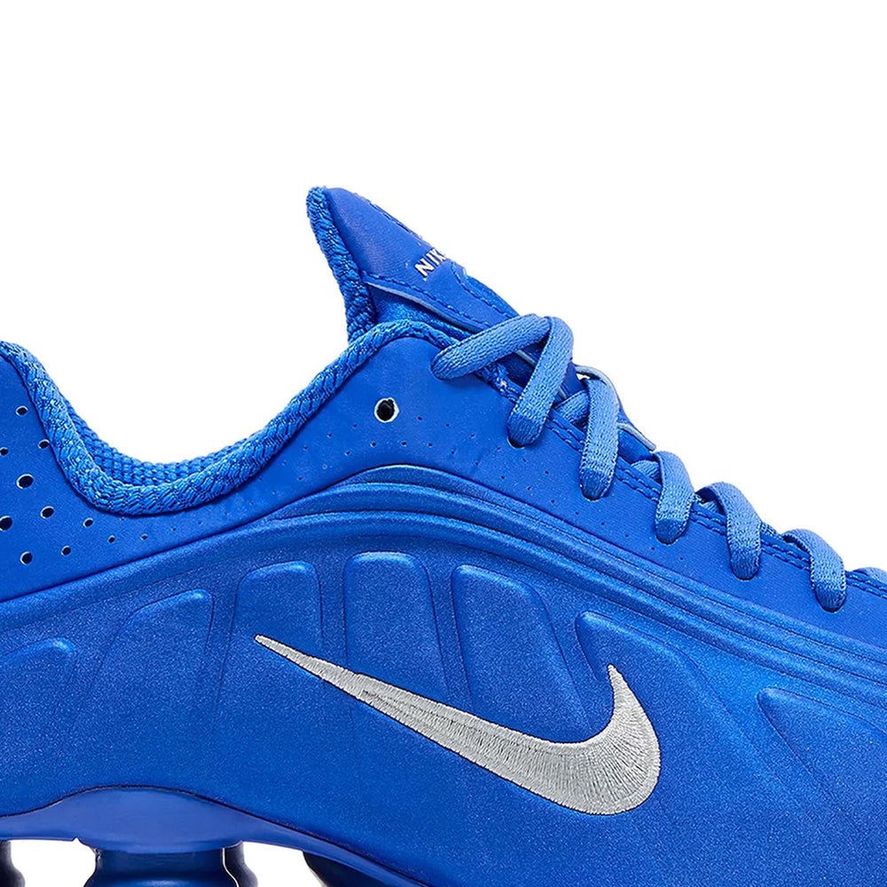 The Nike Shox R4 'Racer Blue Metallic Silver' features a bold Racer Blue upper constructed from a combination of premium leather and synthetic materials. This striking blue base is accentuated by metallic silver overlays that enhance the shoe's dynamic profile. The standout feature is the integrated Shox cushioning system, which provides superior comfort and responsiveness with its signature column-based technology. The sleek, metallic silver accents are further reflected in the eyelets and heel counter, offering a futuristic edge to the overall design. The shoe's breathable mesh tongue and padded collar ensure a snug, supportive fit, while the black outsole with a white Shox column completes the look with a versatile touch.
