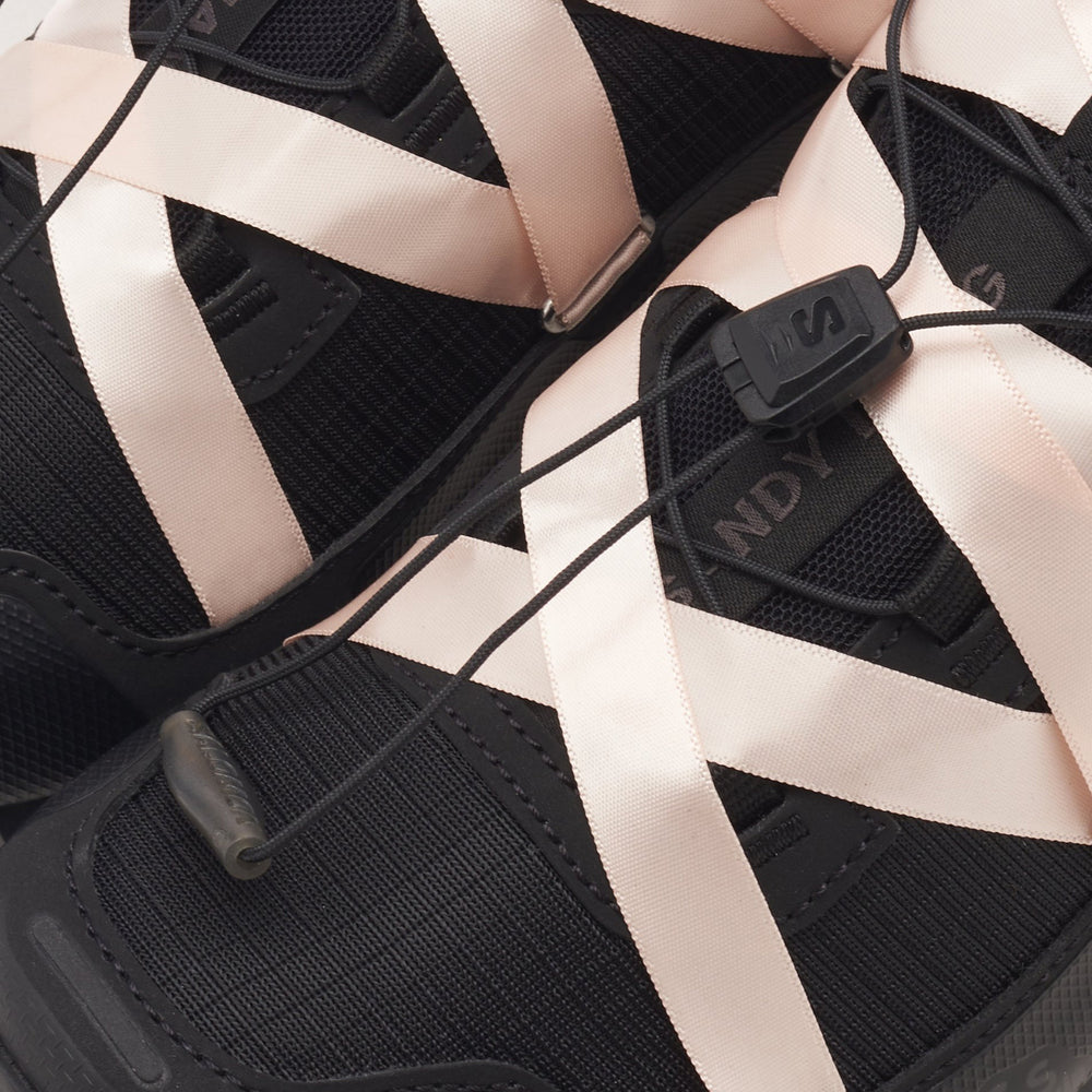 The Salomon Speedcross 3 Ribbon Sandy Liang 'Black Pink' features a dynamic black and pink colorway that exudes contemporary flair while retaining the robust performance qualities that the Speedcross line is known for. The shoe is constructed with a durable black mesh upper, complemented by striking pink accents on the laces, eyelets, and midsole, delivering both style and function. Sandy Liang's signature ribbon detailing adds a touch of elegance and uniqueness, setting this model apart from conventional trail-running shoes. The shoe's design is rounded out with Salomon's iconic Contragrip outsole, ensuring superior traction on all surfaces, and the Sensifit system for a snug, secure fit.